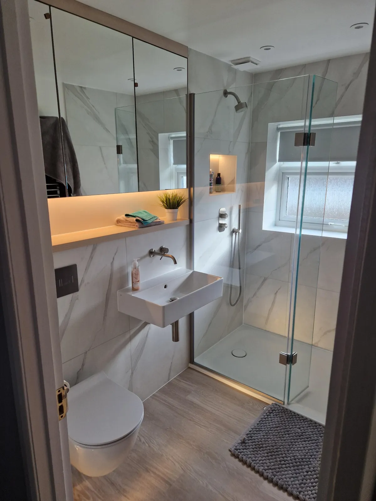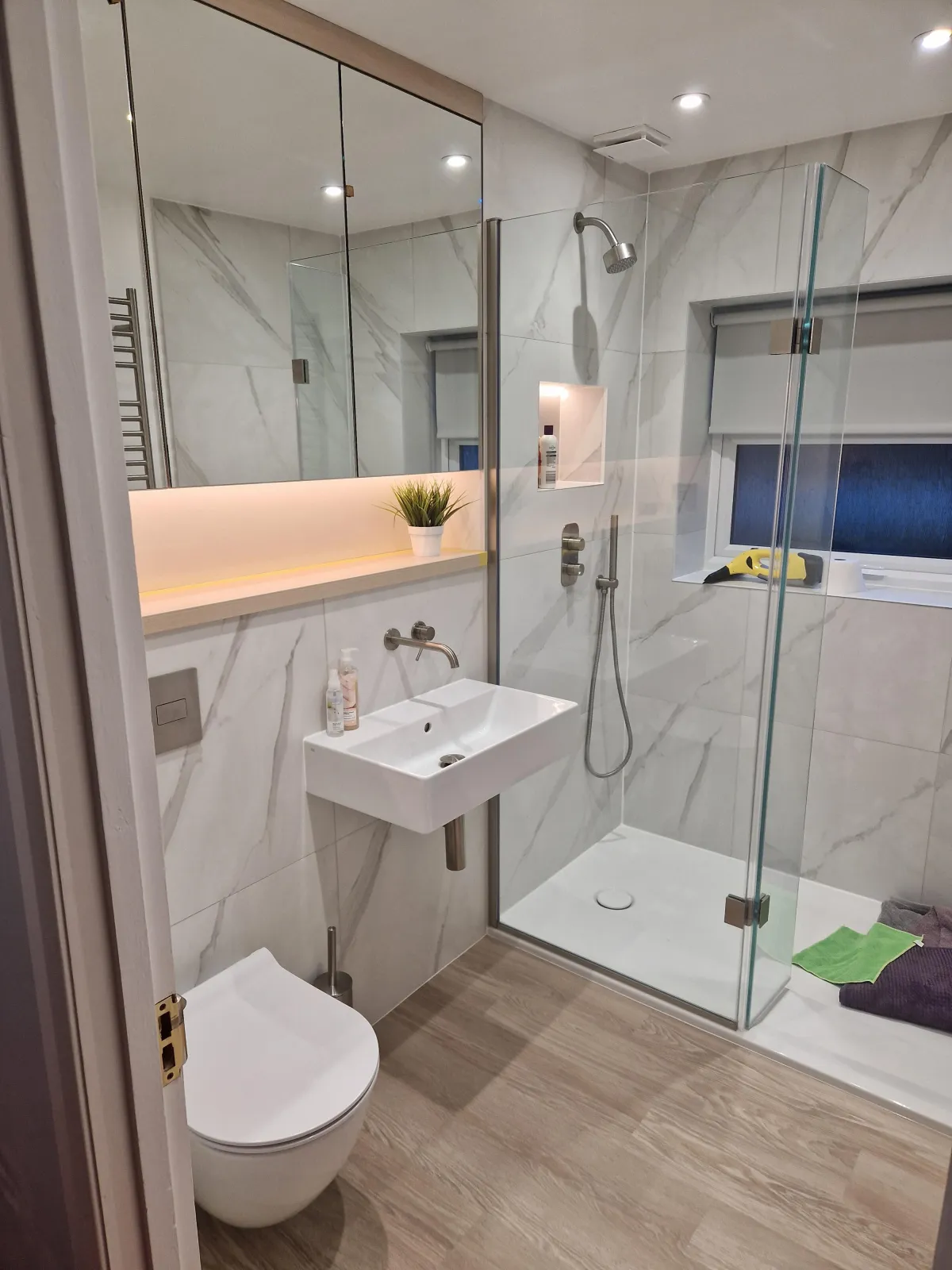 Joinery & Carpentry: Custom-built vanity units and tailored joinery to maximise space and deliver a seamless, high-end finish.