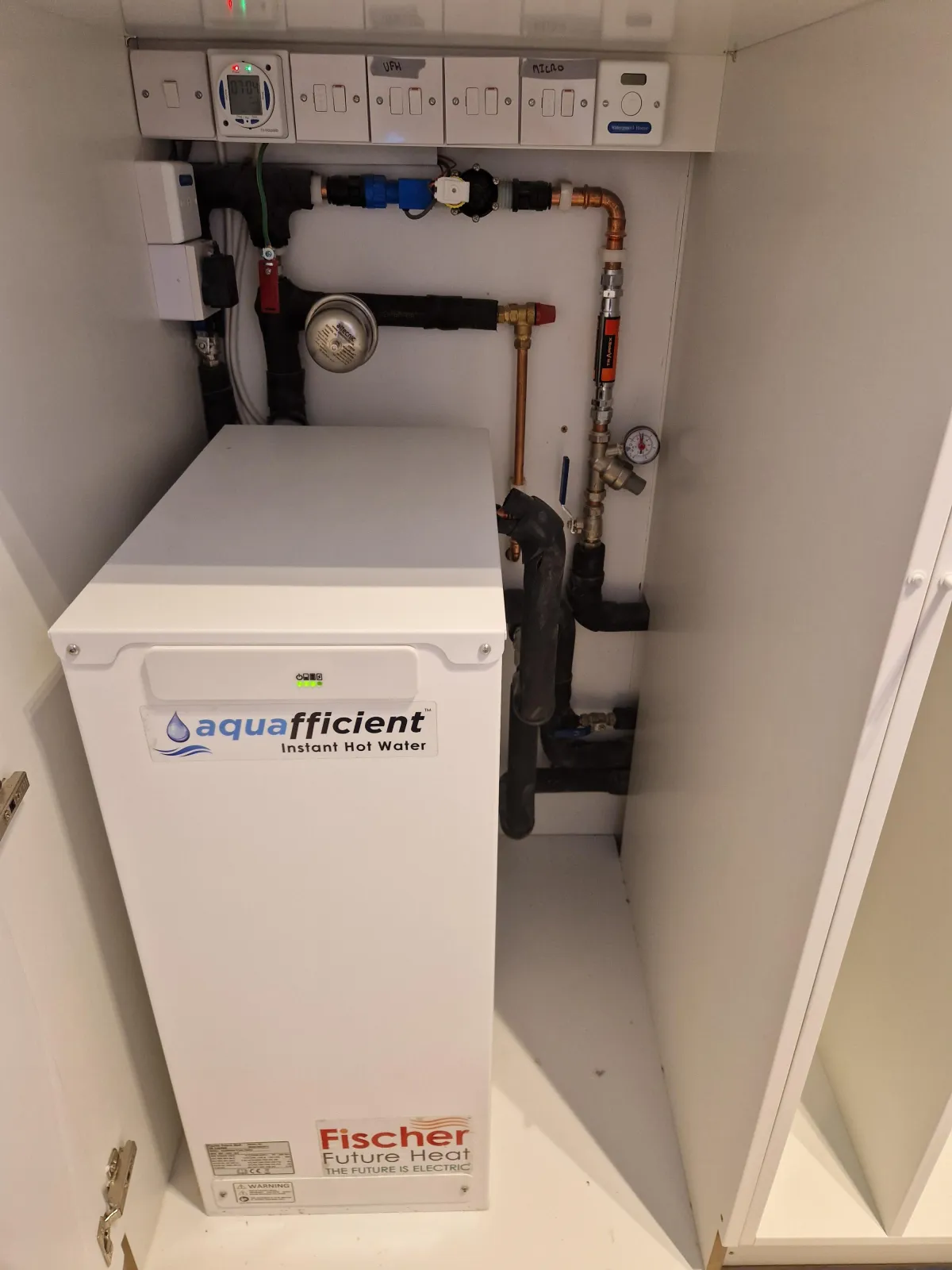 Mounted and connected the Fischer Aquafficient electric boiler to supply both bathrooms and the kitchen.