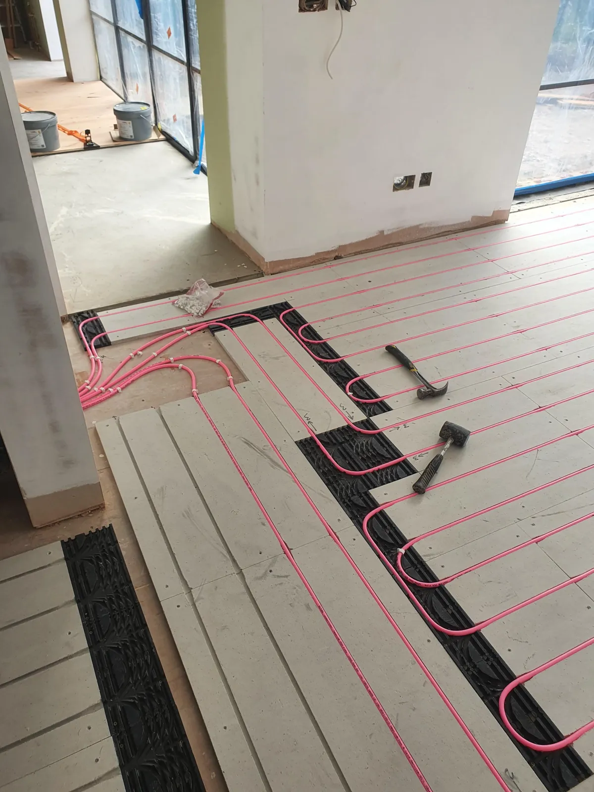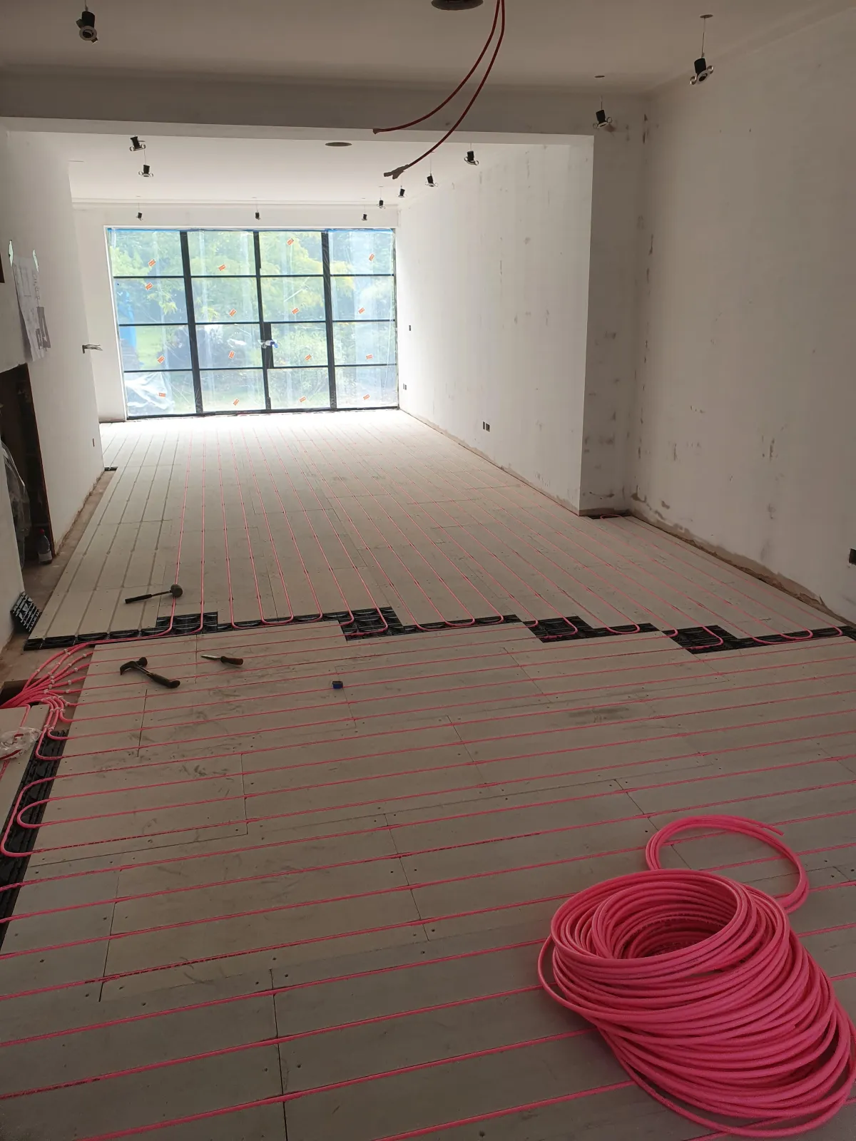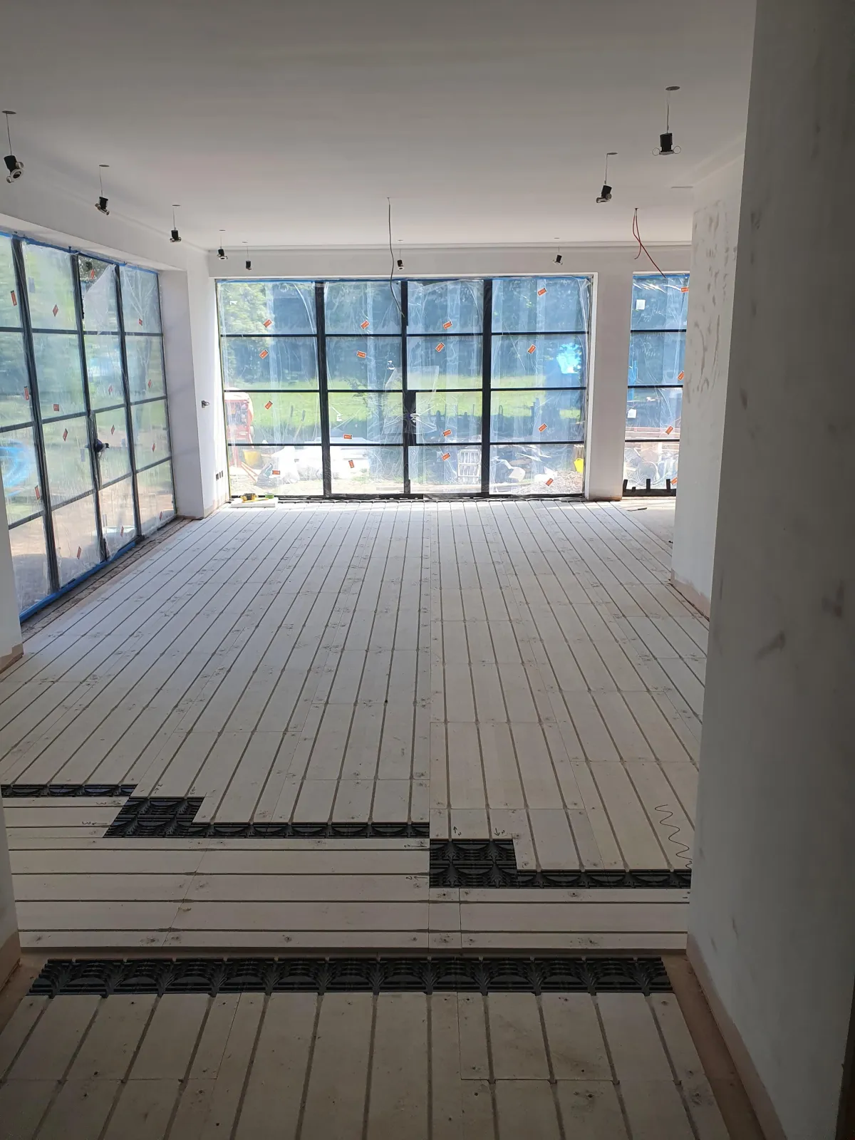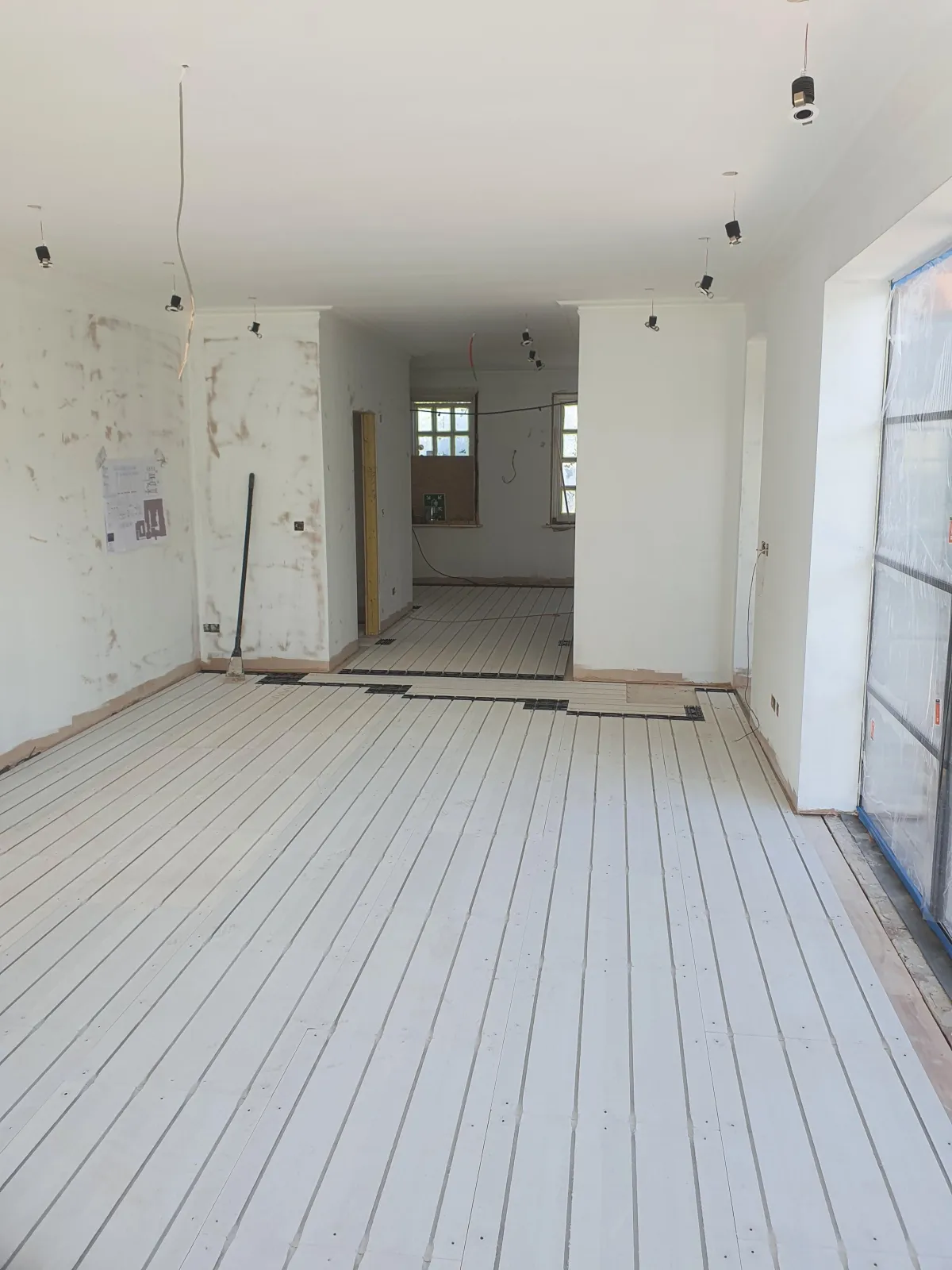 Laid Snug UFH overboard system across lower floors for discreet, low-profile heating.
