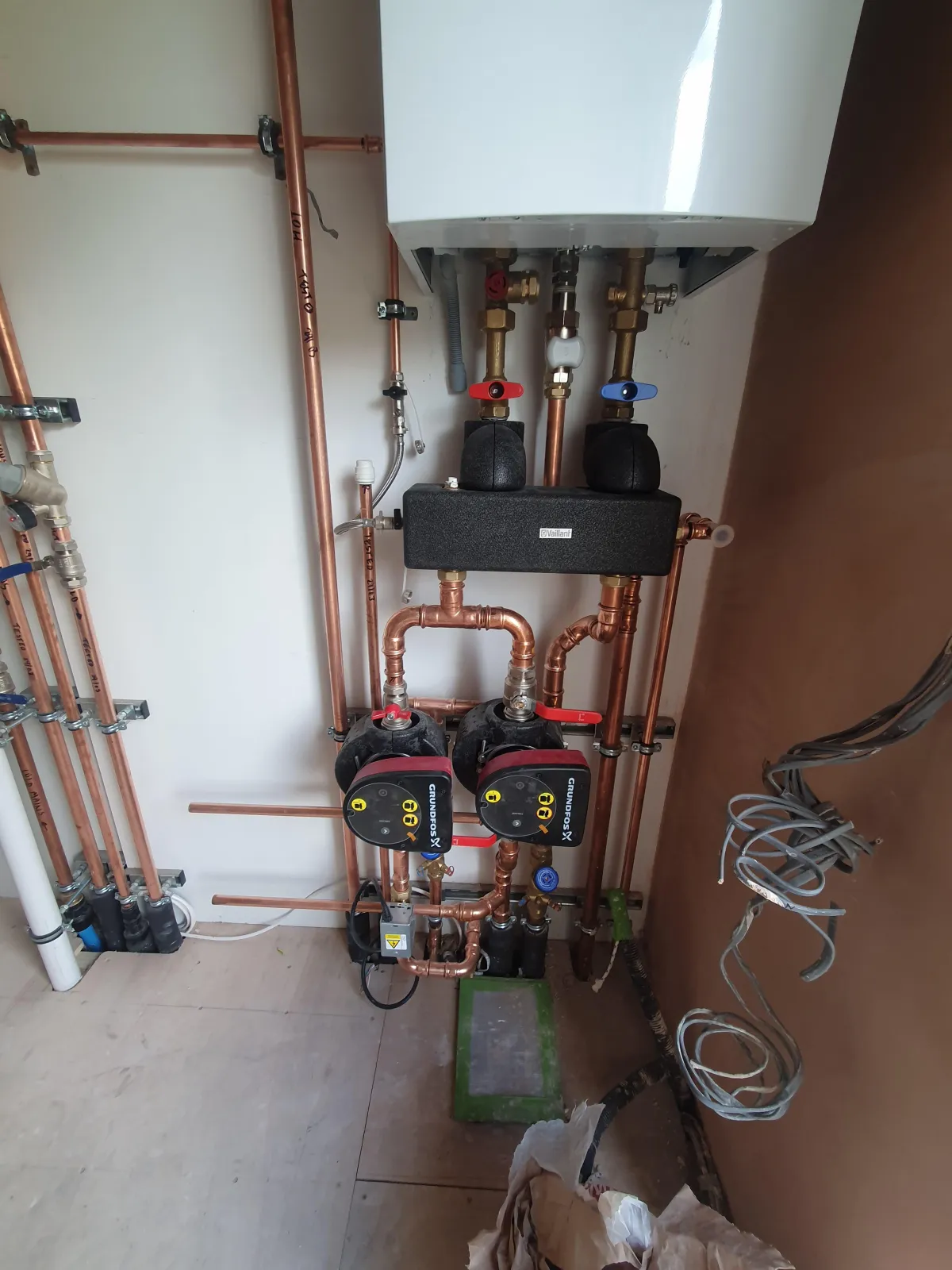 Mounted 15 Castrad cast-iron radiators via radiator manifolds for independent control.
